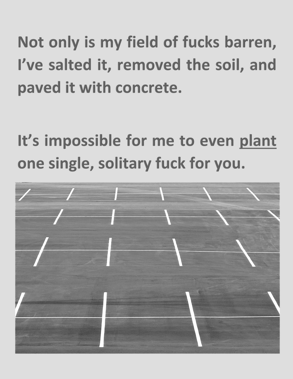 … right back at you. It’s your own fault, anyway. Aside from slavery and legal segregation, you’ve never been worse than you are right now. Not only is my field of fucks barren, I’ve salted it, removed the soil, and paved it with concrete. It’s impossible for me to even plant one single, solitary fuck for you.